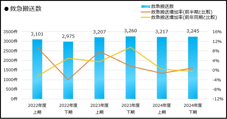 救急搬送数に大きな変化はなく、安定して救急車、ドクターヘリ、病院間搬送などを受け入れています。