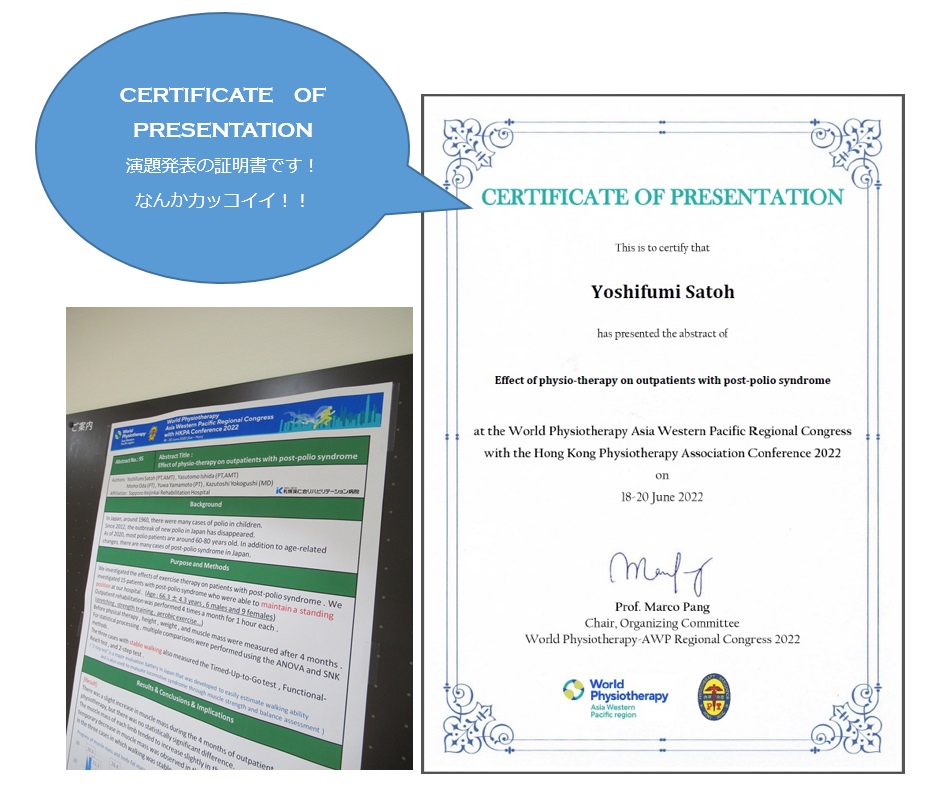 「アジア西太平洋理学療法学術大会2022 in香港」で、リハビリテーション部の佐藤義文部長が演題名~ポストポリオ症候群患者の外来理学療法の効果~について発表されました。