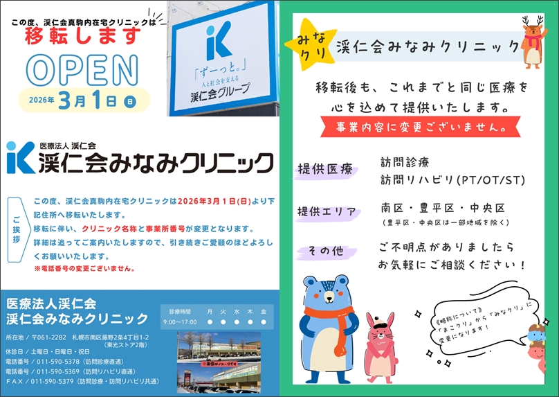 渓仁会真駒内在宅クリニックは3月1日より名称を「渓仁会みなみクリニック」に変更し、「定山渓病院訪問看護ステーションエール」とともに、事業所を下記の住所に移転いたしました。