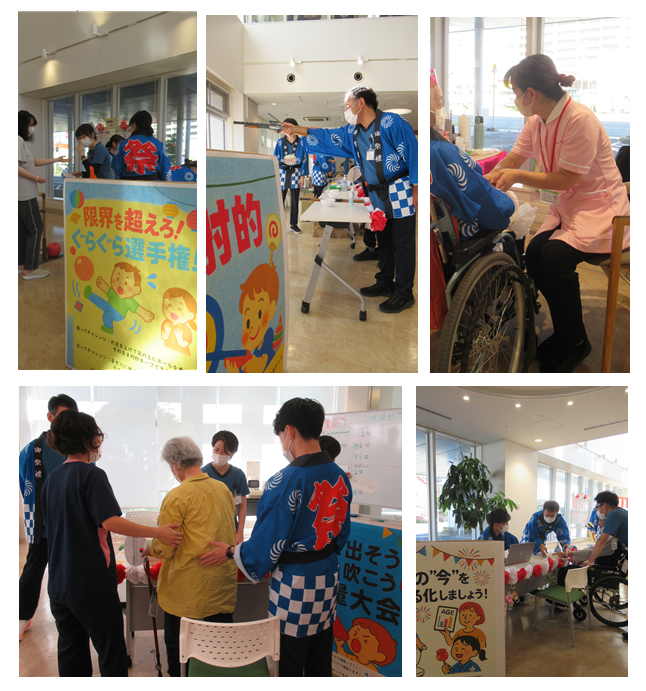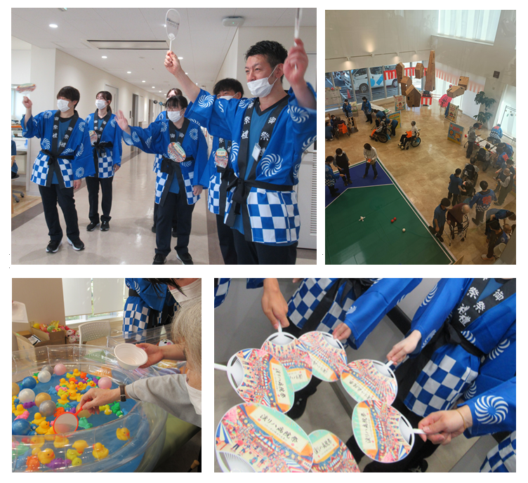 射的、ボッチャ、ヨーヨー釣り、ぐらぐら選手権、声量大会、健康測定など少ない時間でも楽しめるものを用意しました!参加者が全種目回れるようにスタンプラリー形式にしたり、参加した方には漏れなくあたる参加賞も用意をして、患者さんとご家族が一緒に楽しめる企画を考えました。