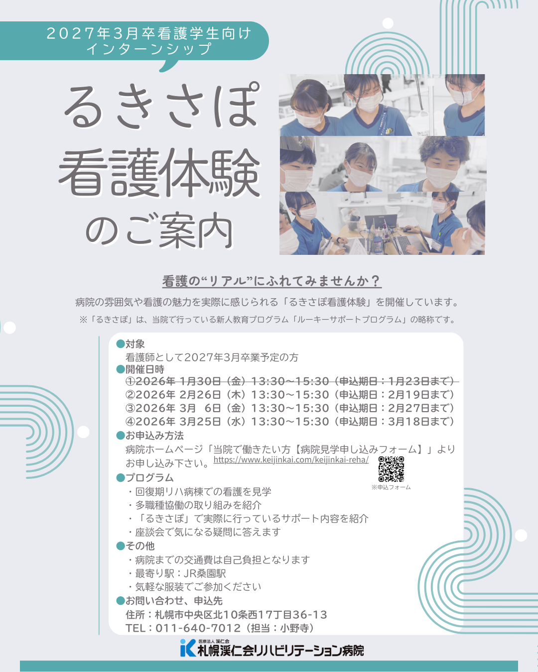 ぜひ、『るきさぽ看護体験』へご参加いただき、渓リハの雰囲気や魅力を体験ください。