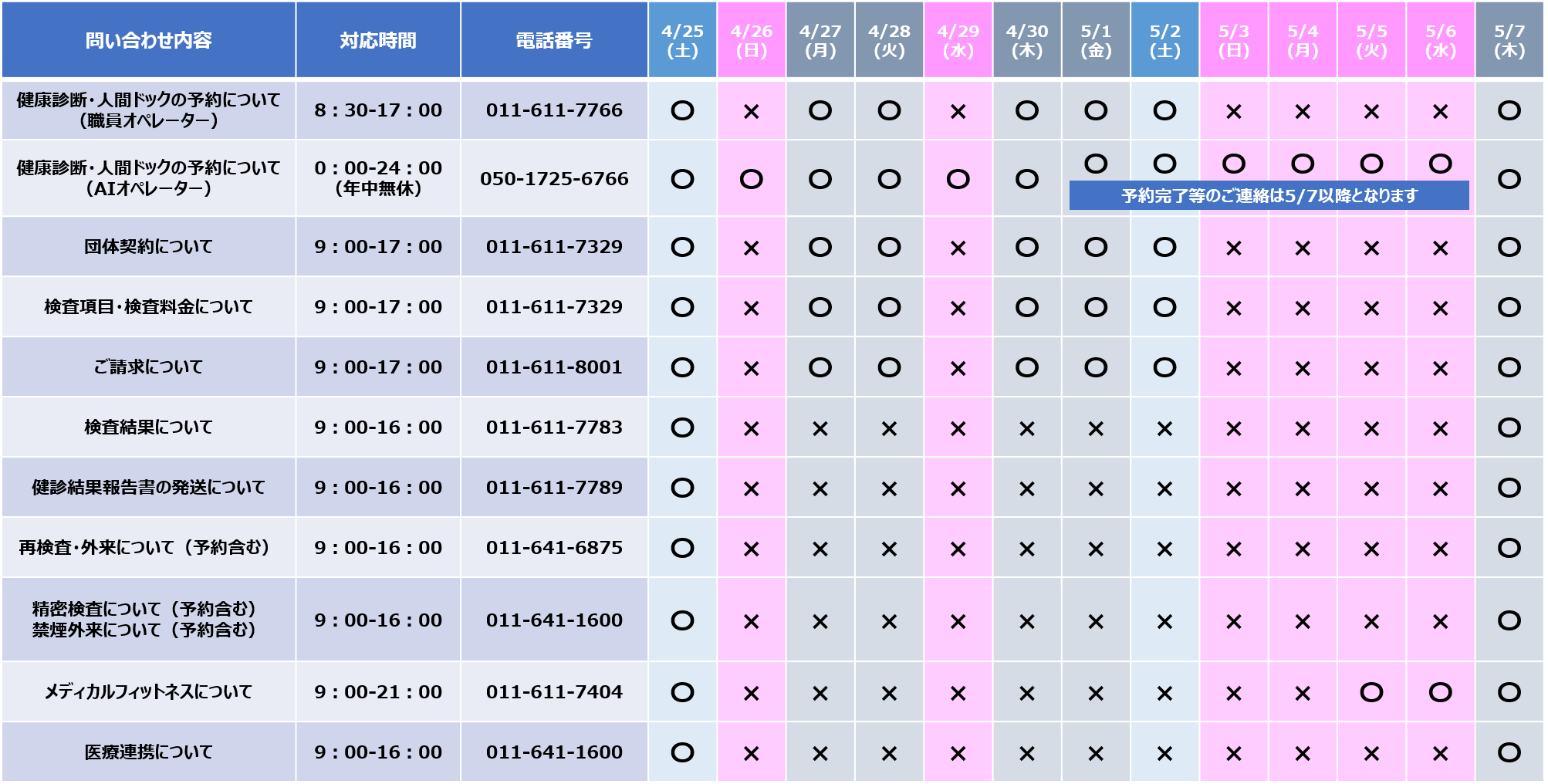 GW期間(4/25~5/7)の電話対応につきまして、下記の通りご案内いたします。