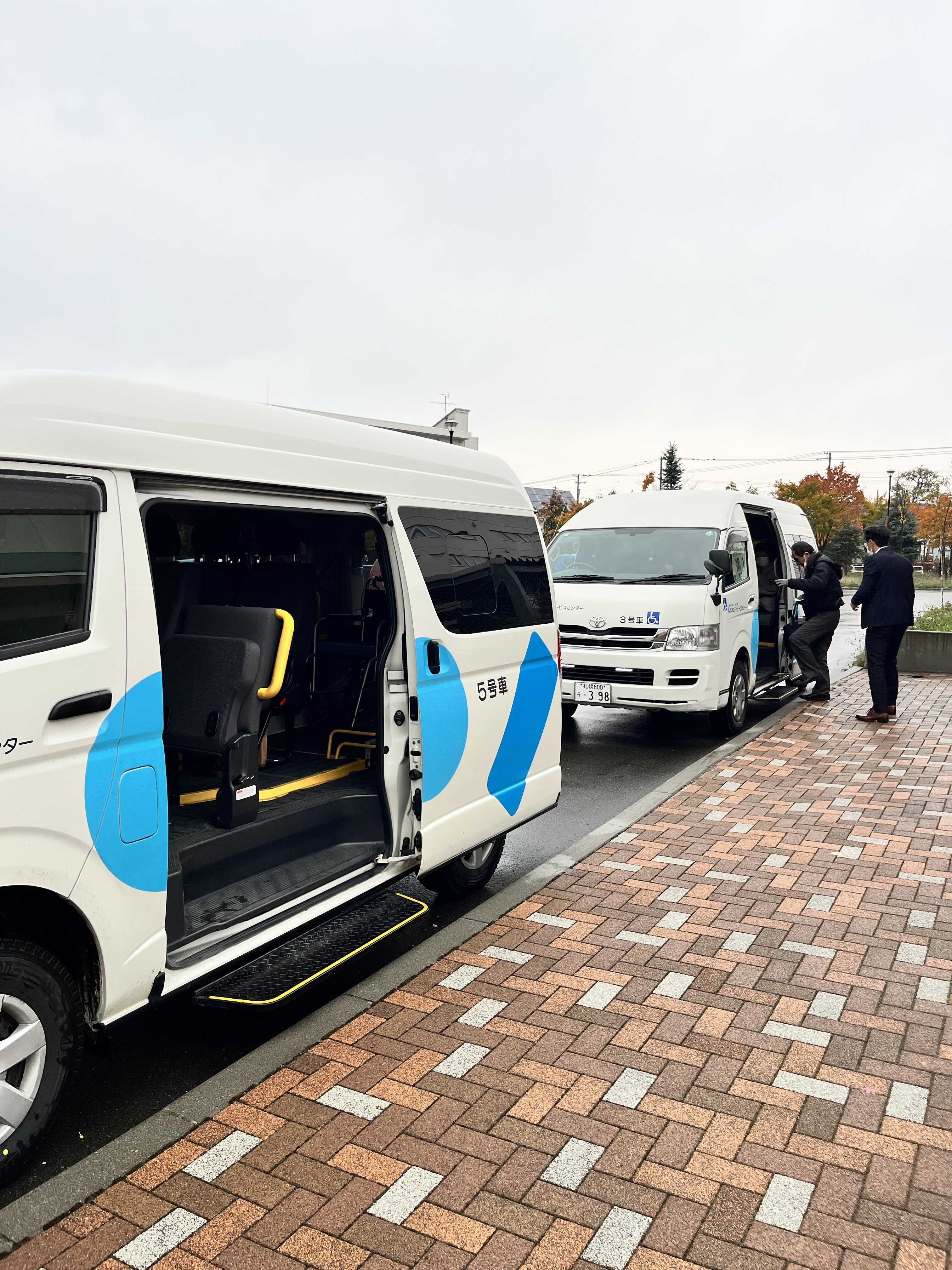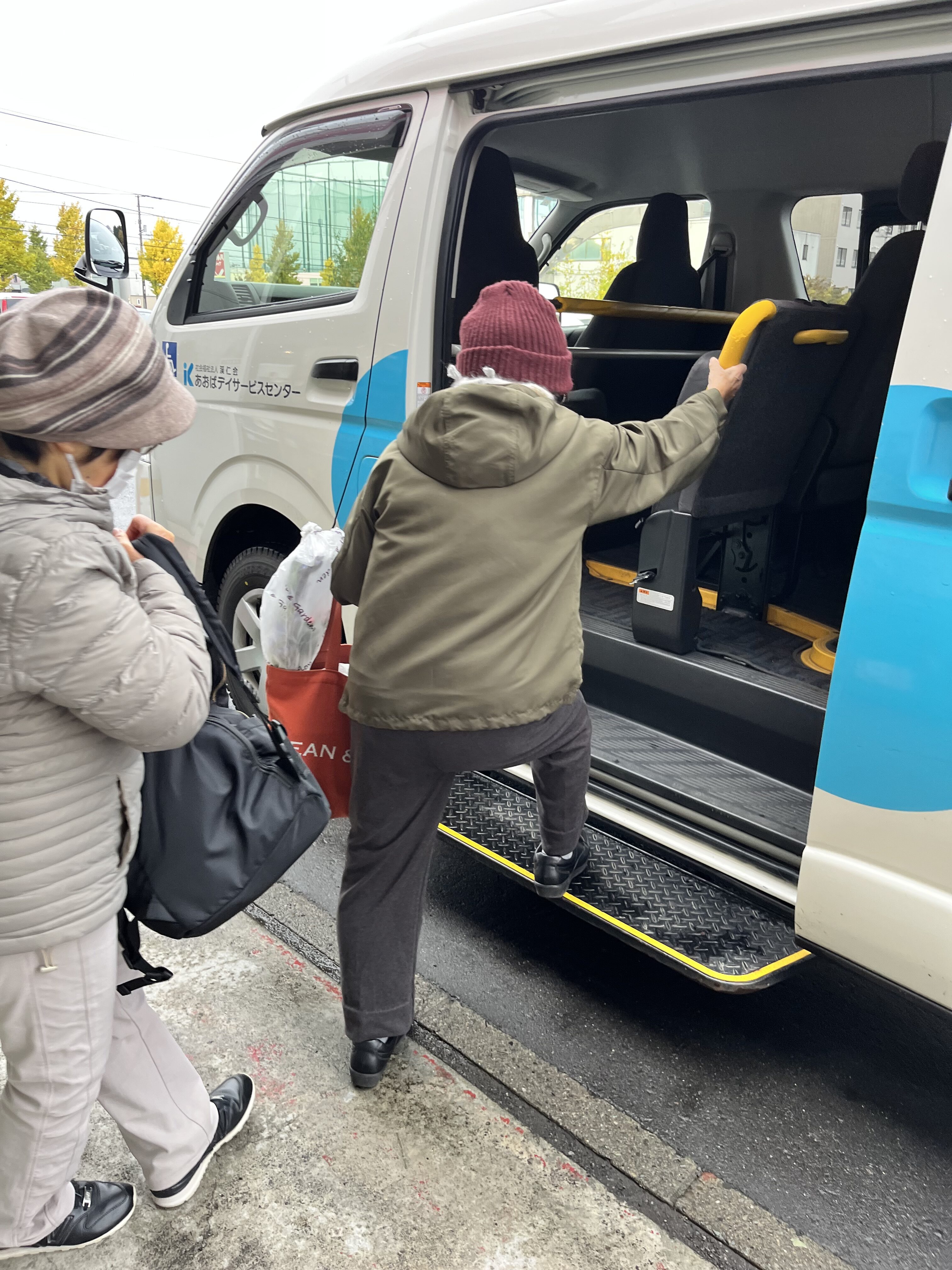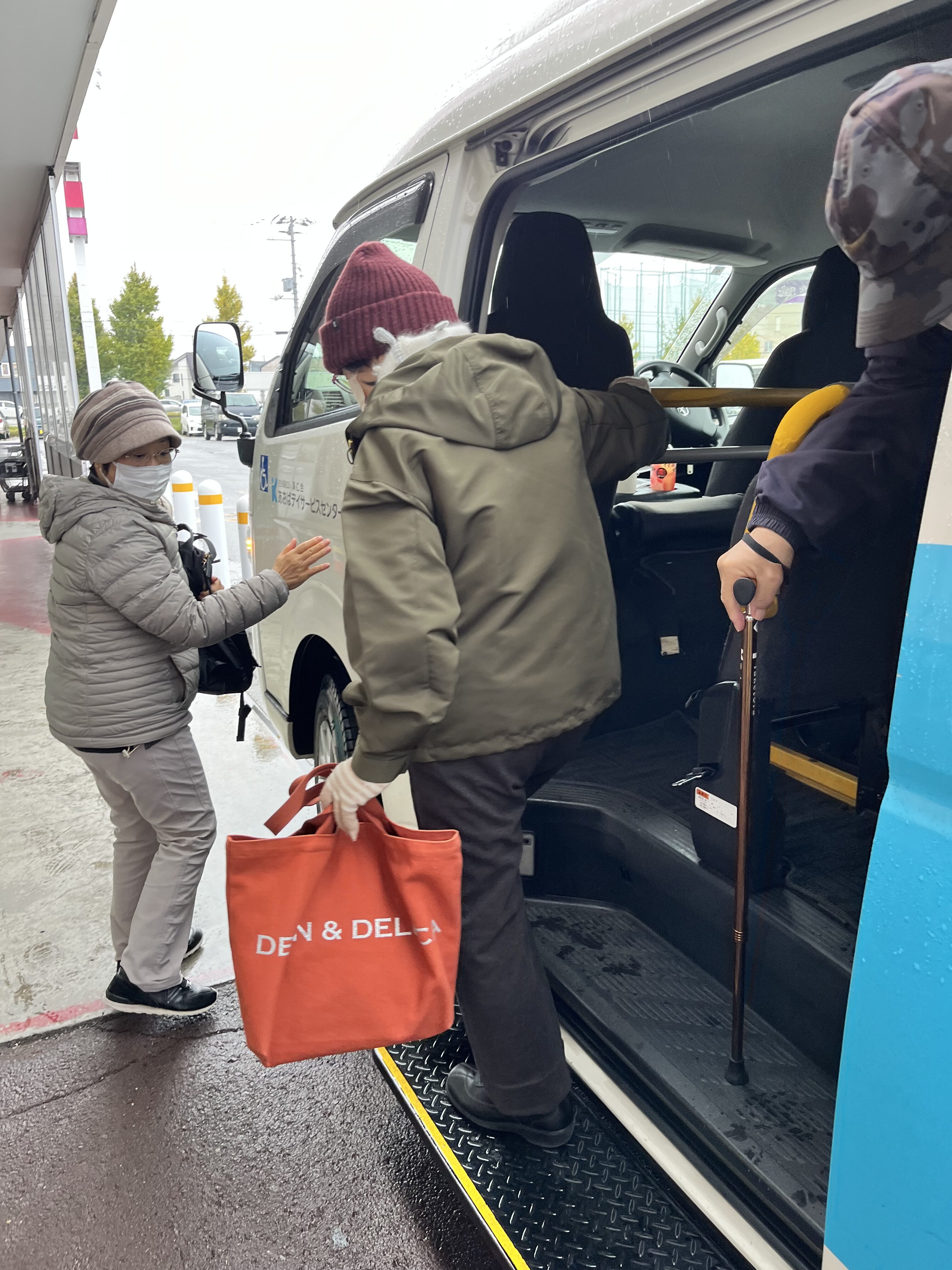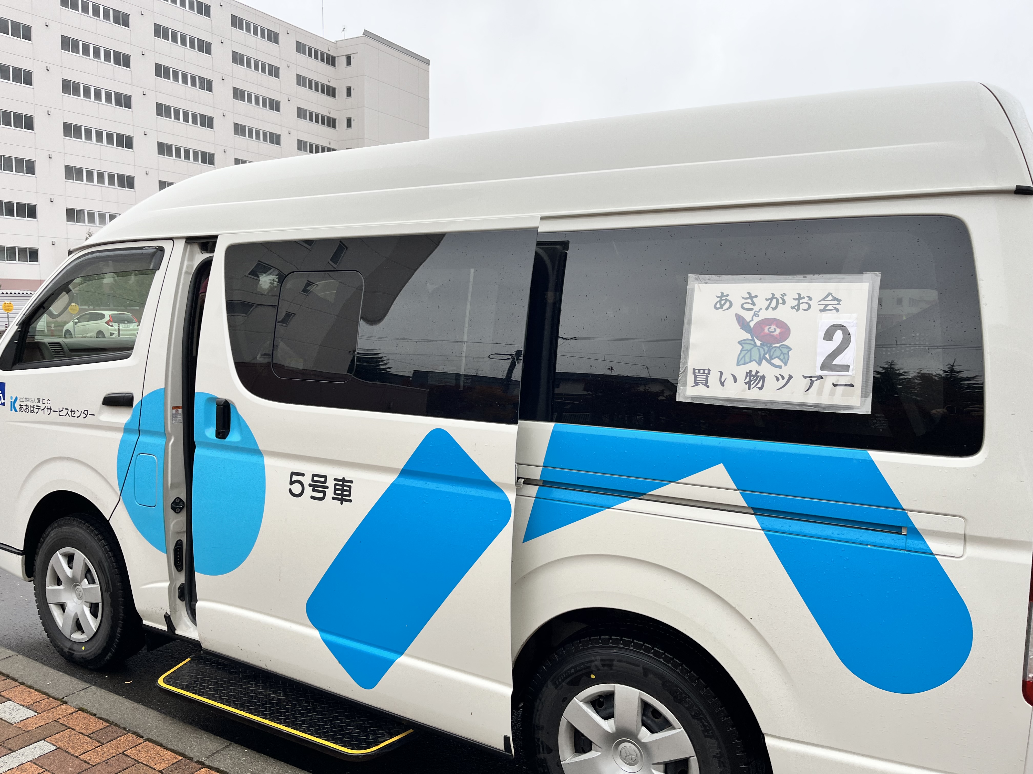 普段はデイサービスで利用者さんを送迎している車両ですが、自治会が行っているお買い物ツアーで多くの人の期待と想いを乗せ、あおばデイサービスセンターの車も走っています。