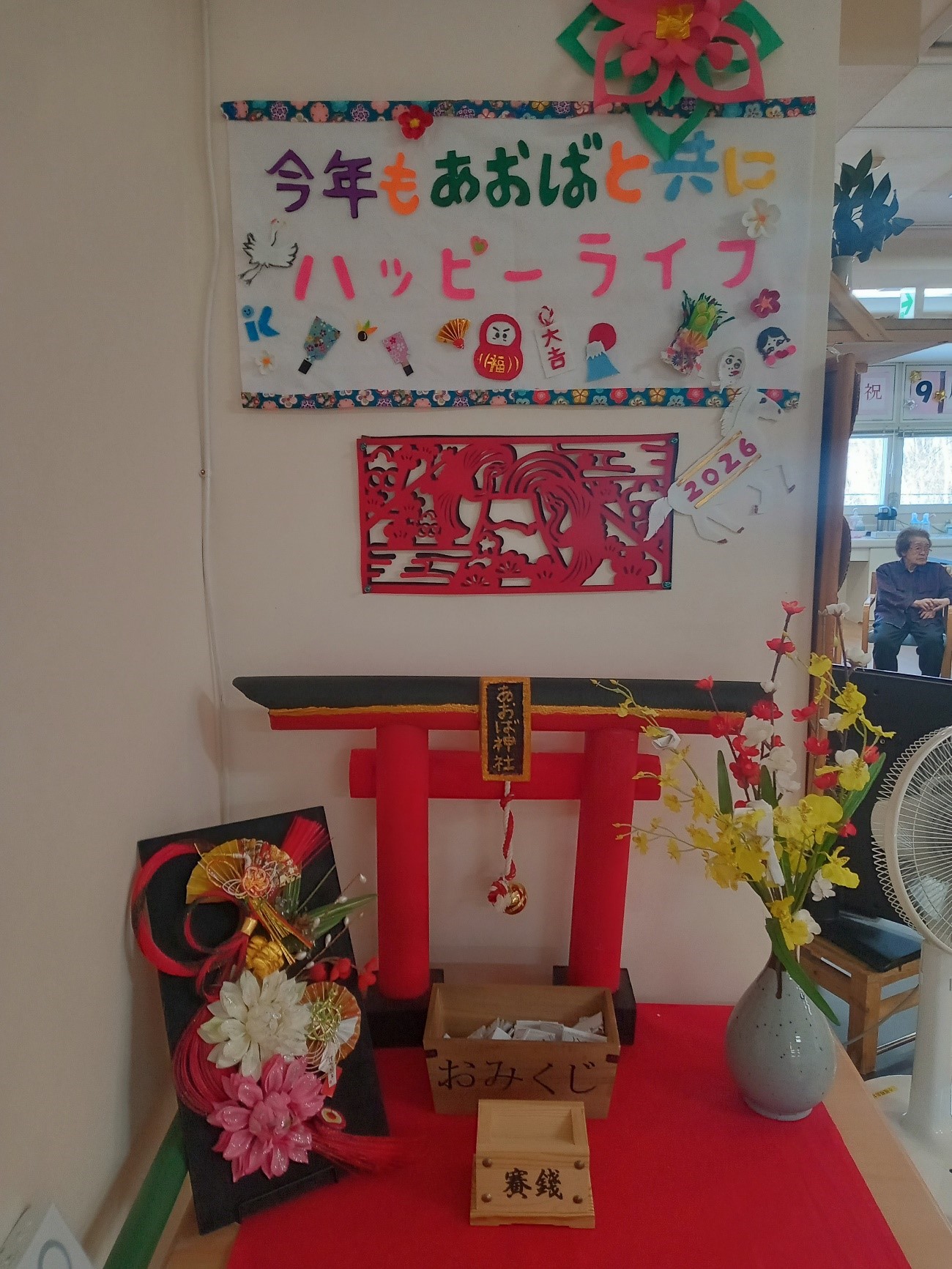 『何事も馬く行く』願いをこめて ~小規模多機能型居宅介護あおば~ 2026.01.15 新着情報 新しい年を迎え、フロア内に作られた神社で初詣をしました。ご自身や家族の健康を祈願し、ご利用者の皆様と一緒に甘酒と大判焼きで新年会を開催しました。小規模多機能型居宅介護あおばでは、季節の移ろいを感じていただくだけでなく、豊かで満ち足りた日々をお過ごしいただけるように積極的な活動を支援しています。