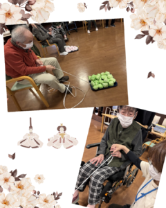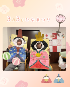 ひな祭りを開催しました🌸 2026.03.13 新着情報 3/3日はひな祭りでした🌸デイサービスでは利用者さんとレクリエーションを行いました。大きなひなあられを落とさないように運んだり、ひな人形を運び雛壇を完成させるゲームをして楽しみました♪大きなあられを「落とさないようにね!」と声を掛け合いながら皆様笑顔で楽しまれてい ましたよ ^^) 施設玄関前には雛人形を飾っており「とっても素敵」「昔は家にも飾ってた」などの声も聞かれました♪ 今年も健康で元気に、春を迎えられますように🌸