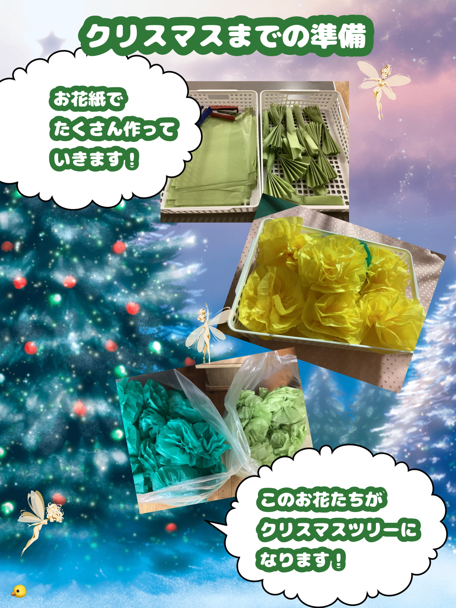 利用者さまにも協力していただき、🏵️お花紙で作るクリスマスツリー🌲の準備が進んでいます