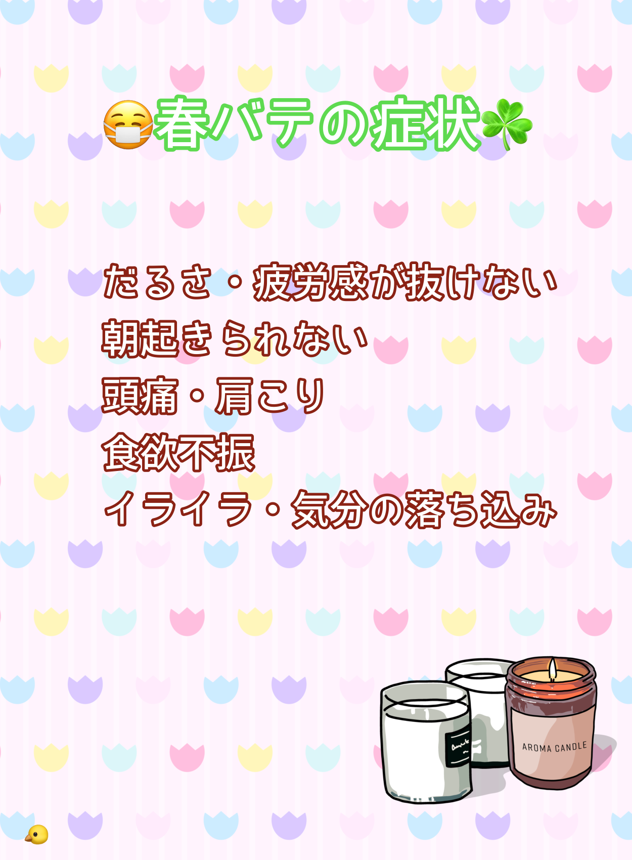 春バテは寒暖差による①自律神経の乱れ、②環境の変化によるストレス、③生活リズムの乱れが原因で起こると言われています😞