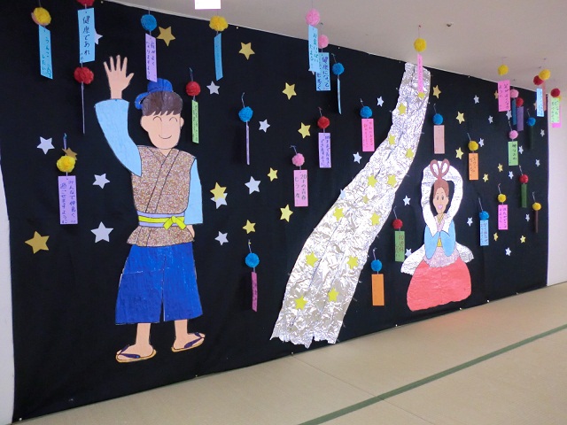 7月の壁画! 2013.07.01 新着情報 7月に入りました。 今日も暑いですね。 ステージの壁画も夏らしくなりましたよ!! テーマは七夕です。 飾りも七夕らしくなりましたよ♪ 風に揺られてヒラヒラしています☆
