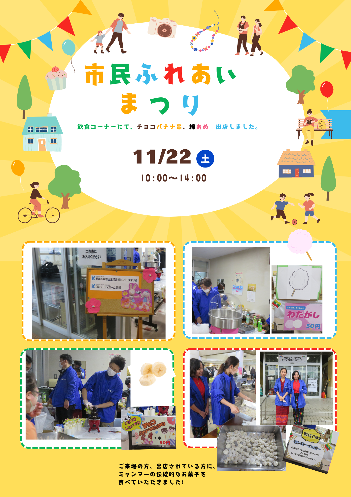 市民ふれあいまつり 2025.11.27 新着情報 11月22日(土)美唄市社会福祉協議会が主催する年に一度のイベント「市民ふれあい祭り」の飲食コーナーに出店させていただきました。出店内容は、チョコレートフォウンテンによる「チョコバナナ串」「綿あめ」です。ミャンマー伝統のお菓子「モンローイエポー」は、ご来場の方、出店されている方に無料で食べていただき、特に「美味しい」と大評判でした!