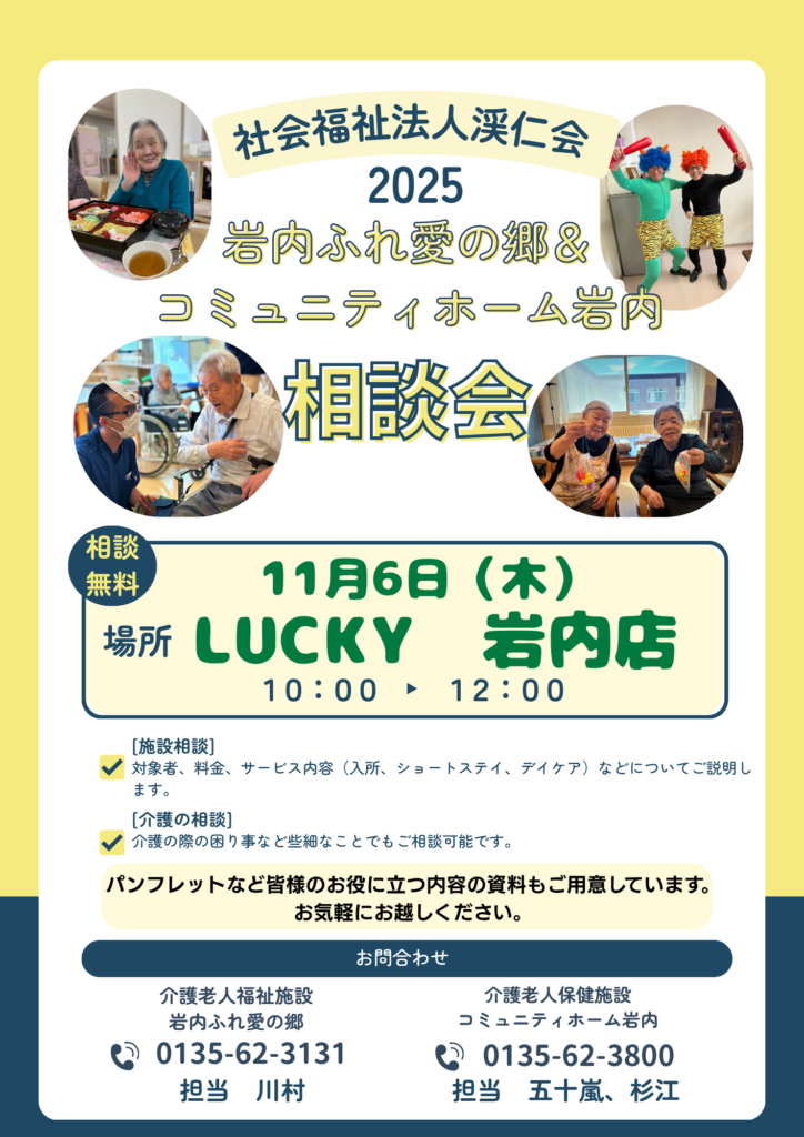 【コミ丘】相談会 チラシ 2025.10.31 新着情報 11/6(木)にラッキー岩内店にて岩内ふれ愛の郷・コミュニティホーム岩内の相談会を開催します! 興味のある方は是非いらっしゃってください(^^)/