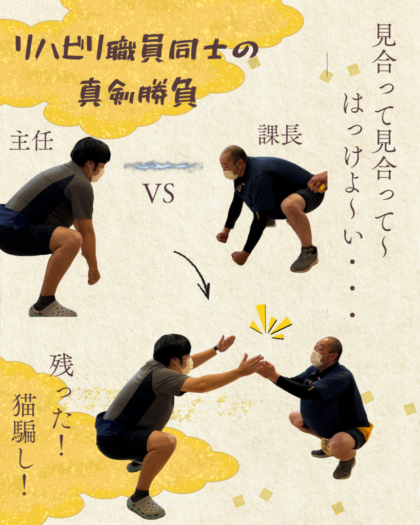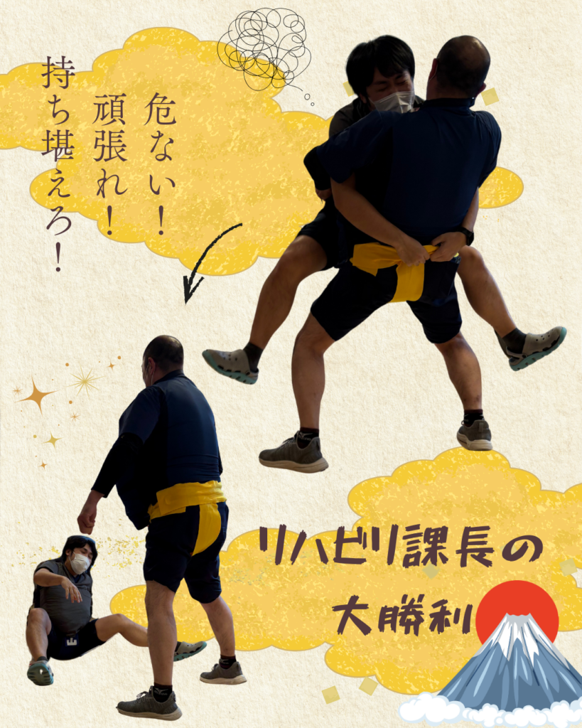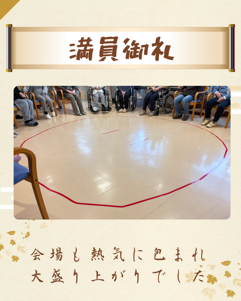 【コミ岩】相撲大会 2026.01.20 新着情報 コミ岩のユニットで相撲大会が行われました📣 手作り土俵のまわりにはお客さん(利用者さん)がいっぱい!選手(リハビリ職員)も気合が入ります(^^)/ 「いけ!押せ!」「がんばれ~!!」大きな歓声が飛び交い、白熱した戦いとなりました🌠