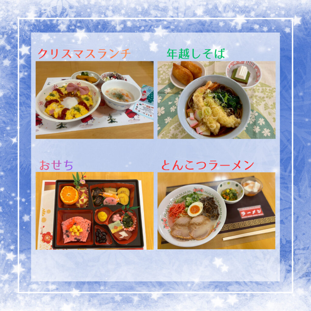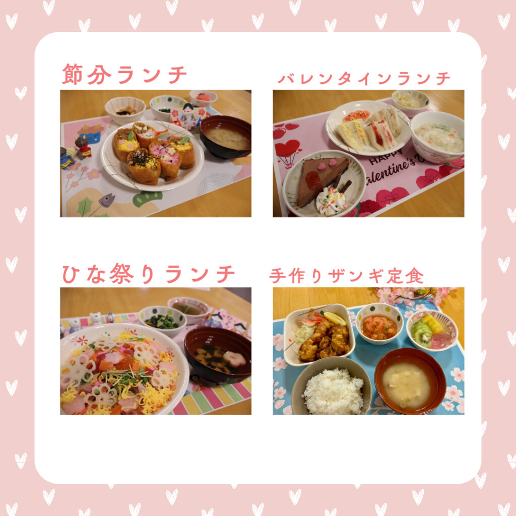 【コミ丘】2025年度下半期 行事食集🍴 2026.03.30 新着情報 コミュニティの丘では、3名の管理栄養士と調理師が食事を担当してくれています。毎食を施設で作り、ご利用者に提供してくれています。とても美味しい食事🍴特に行事食には力を入れており、味・見栄えともに最高です!職員も食べることができます。私たちと一緒に働きませんか?