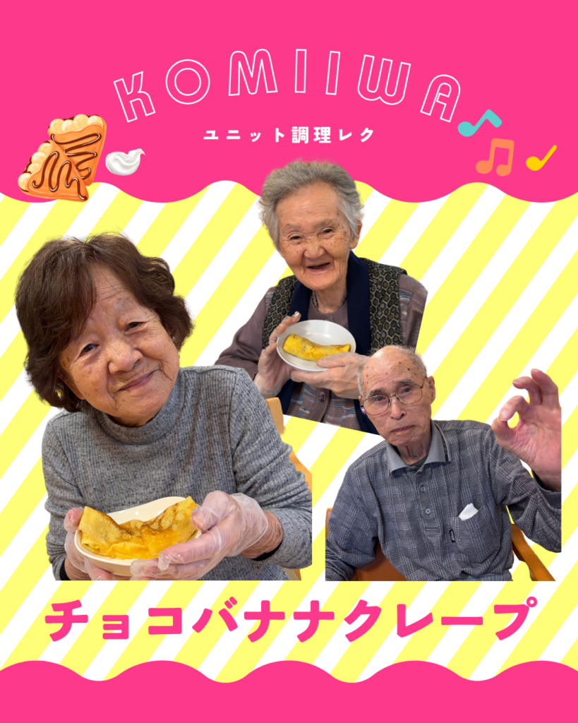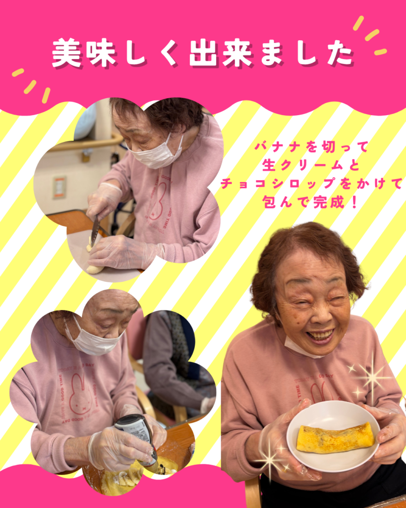 【コミ岩】チョコバナナクレープ🍌 2026.04.03 新着情報 コミ岩のユニットで調理レクを行いました🎶 今回作ったのは、チョコバナナクレープ🍌🍫💗 ユニットには甘い匂いが漂い、とっても美味しいクレープの出来上がり( *´艸`) 食後のスイーツの時間は至福のひと時でした✨
