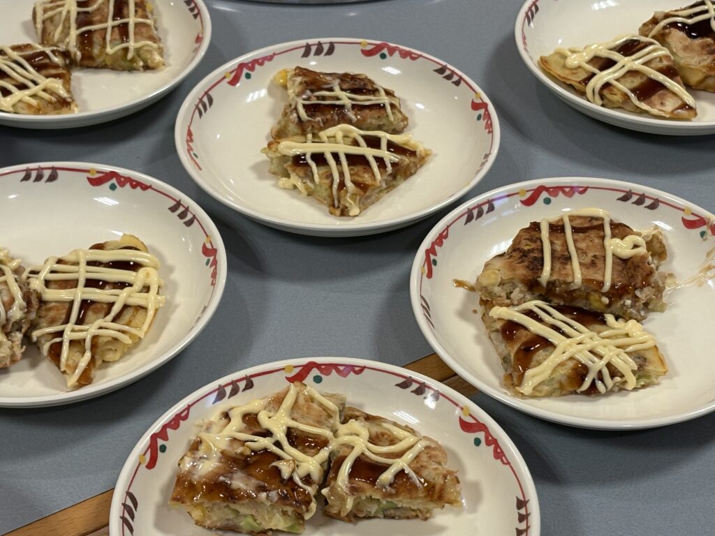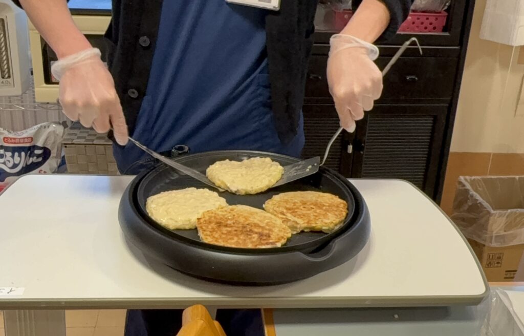 次に、皆さんが切ってくださった具材を他の材料と混ぜ生地を作り、ホットプレートで焼きました。