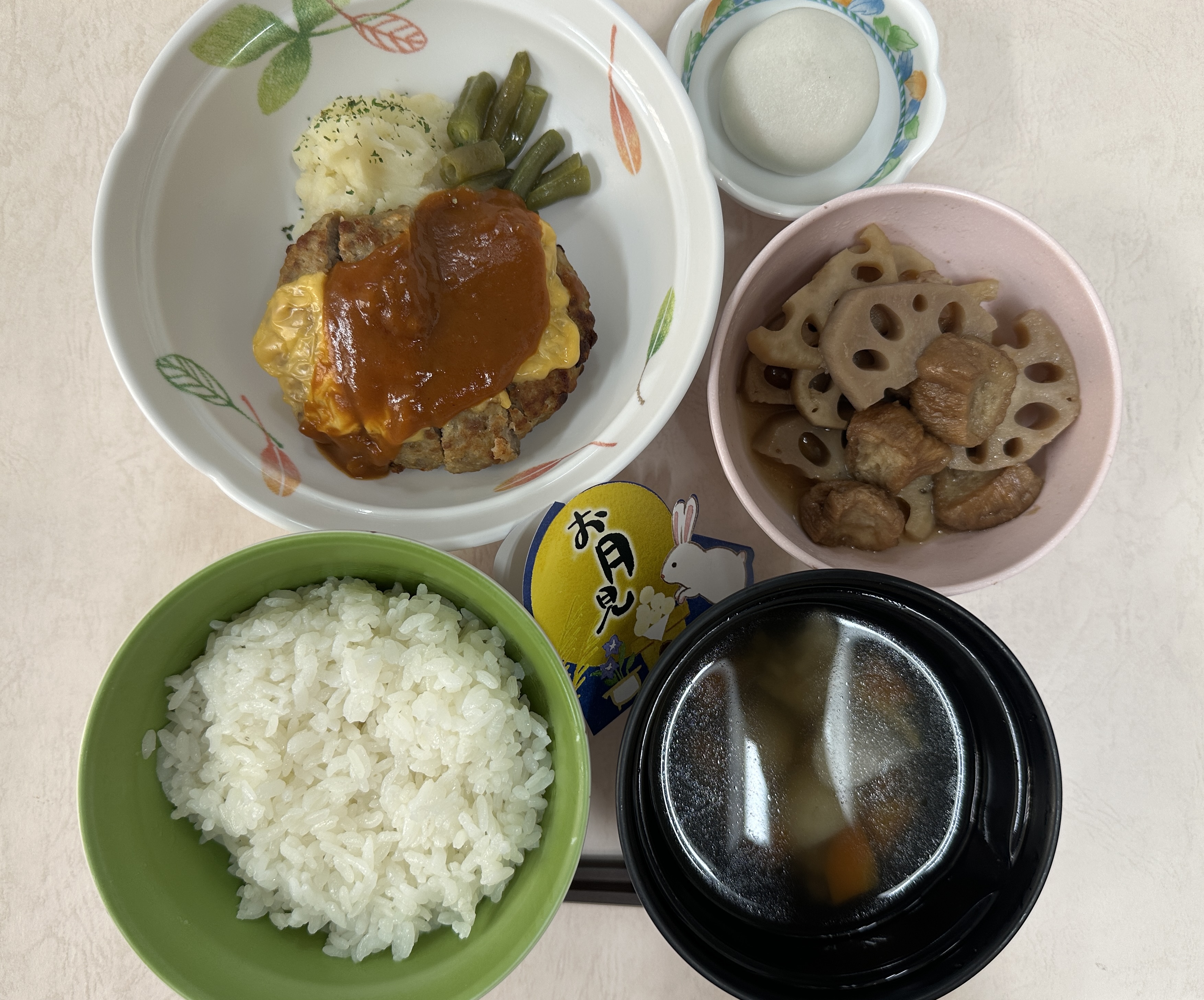 10月6日は十五夜のメニューで「ご飯・チーズハンバーグ・油麩とれんこんの煮物・芋煮汁・饅頭」を提供しました🌕