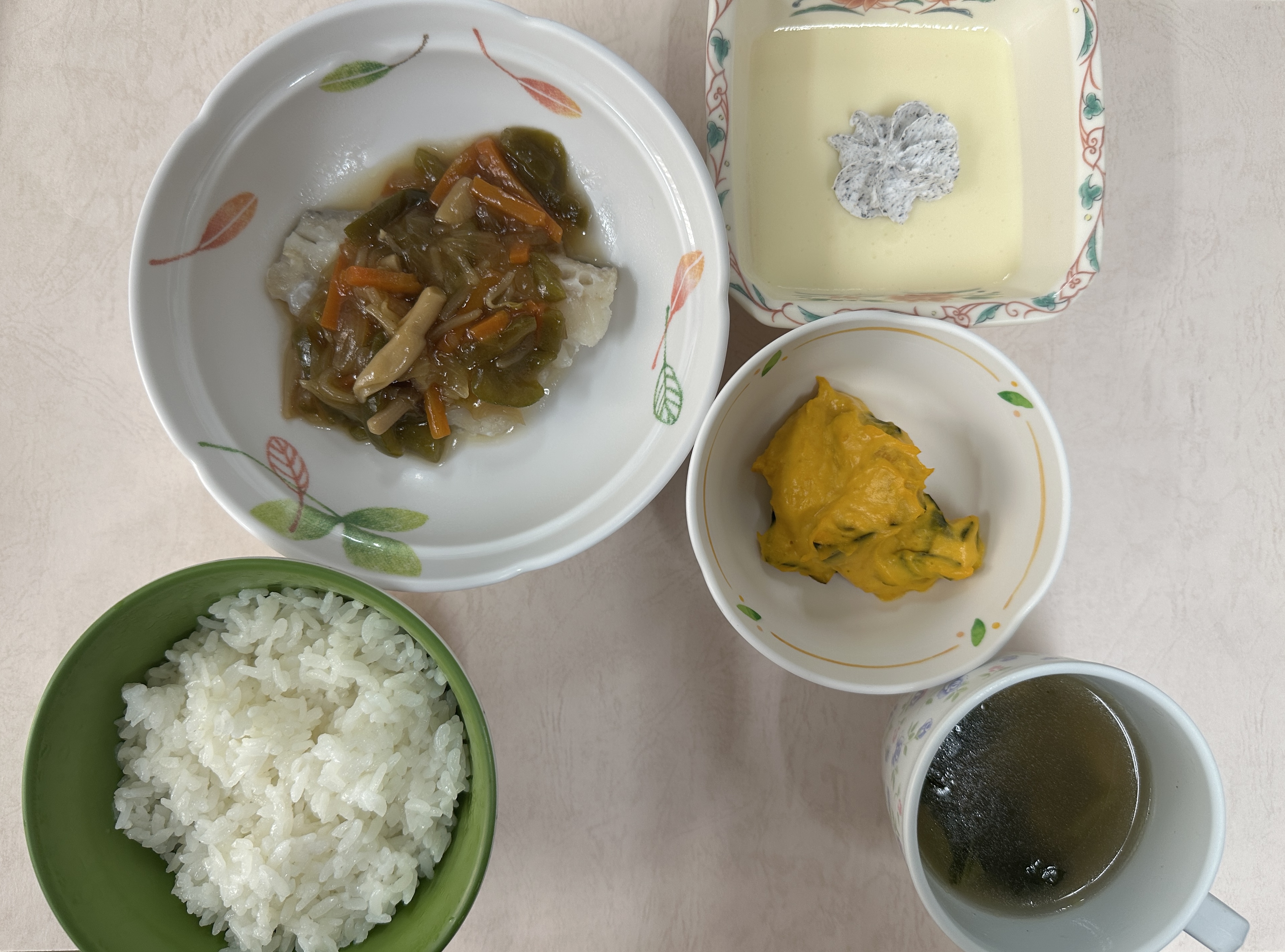 10月9日は、天使大学からの実習生が考案したメニューで「ご飯・彩り野菜とたらのあんかけ・かぼちゃサラダ・小松菜とえのきのスープ・黒ゴマホイップのせプリン」を提供しました。