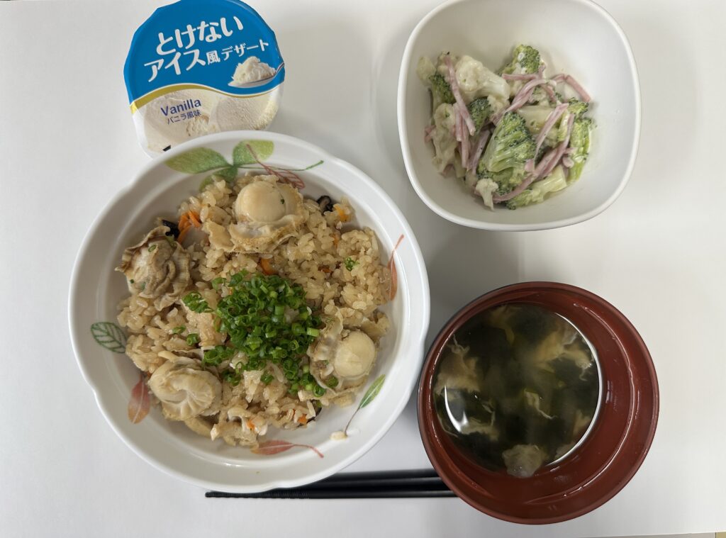 11月21日は、ホタテおこわランチで「ホタテのおこわ・花野菜サラダ・味噌汁(卵・ワカメ)・溶けないアイス風デザート」を提供しました。