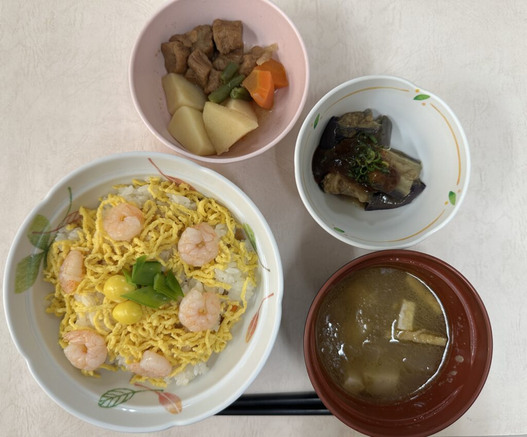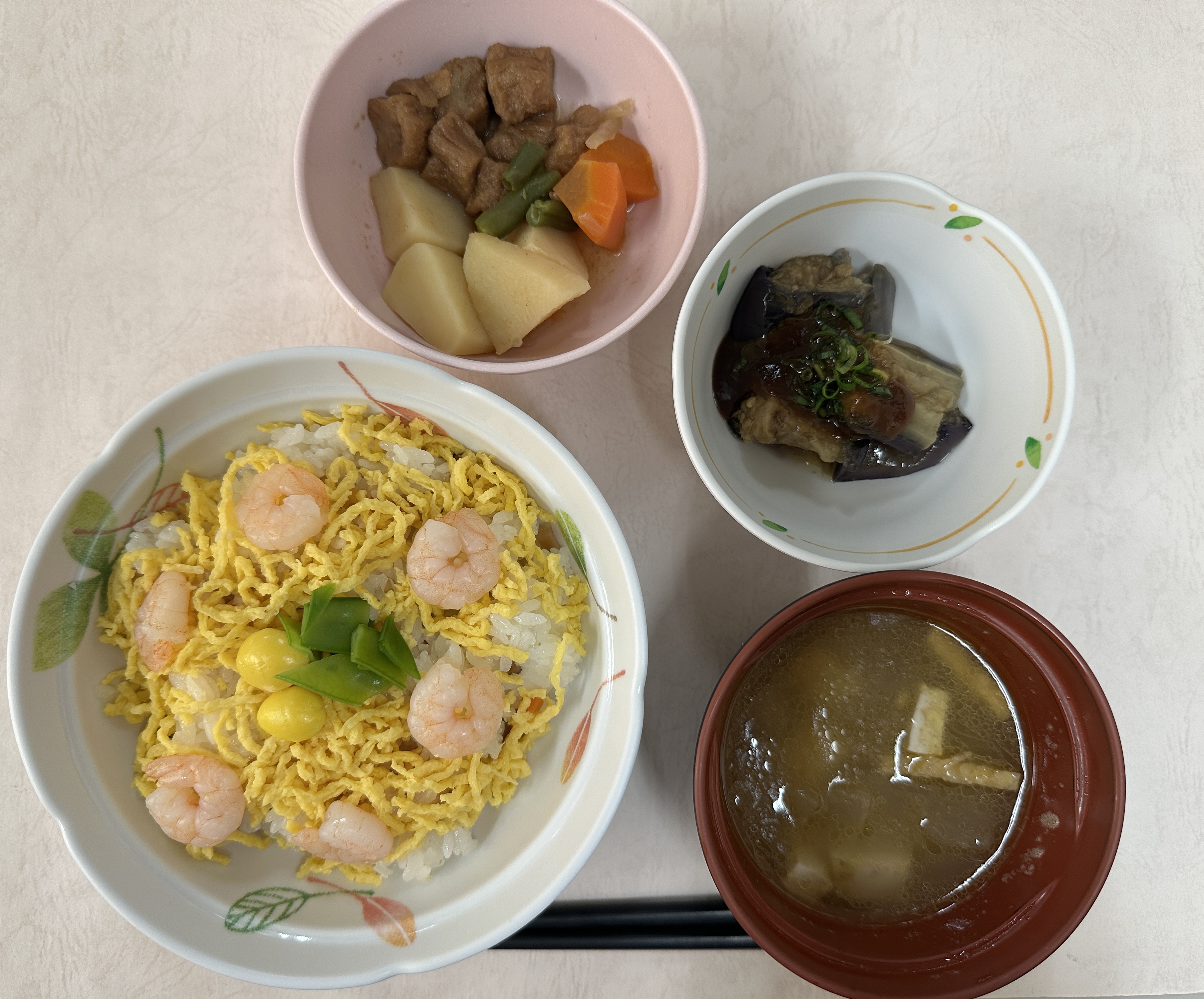 11月6日は、秋の実り御膳で「秋のちらし寿司・油麩とじゃが芋の煮物・なすの田楽・けんちん汁」を提供しました。