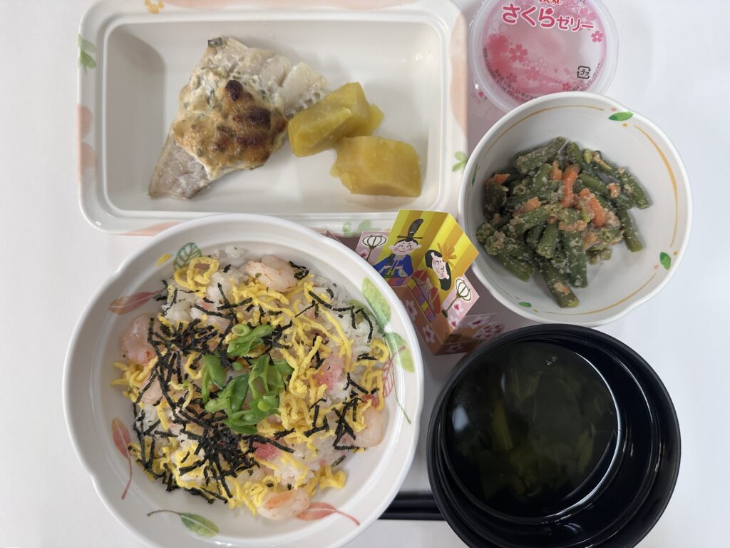 3月3日はひな祭りで「ちらし寿司・たらのねぎ味噌マヨ焼き・いんげんのごま和え・春のすまし汁・さくらゼリー」を提供しました🎎
