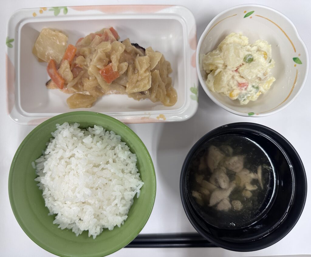 3月16日は旅するランチ~北海道~で「ご飯・サーモンのチャンチャン焼き・じゃが芋サラダ・のっぺい汁」を提供しました🐟