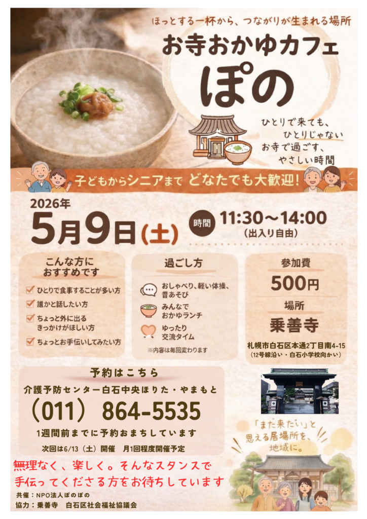 そして、5月より場所をお借りいただくのは、乗善寺さんです。おかゆを食べる前にお勤めの時間もあります。お一人暮らしの方もここにくれば、一人じゃないです。小さいお子さんからご高齢の方までどなたでもお越しいただいて大丈夫です♪ お待ちしています🎵 そして、お手伝いしてくださる方も大大募集中です😊 詳しくはチラシをご覧くださいね✨ ↓