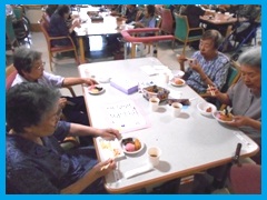 | 昼食の時間となり職員やボランティア様が準備してくれた食事がたくさん用意されています。