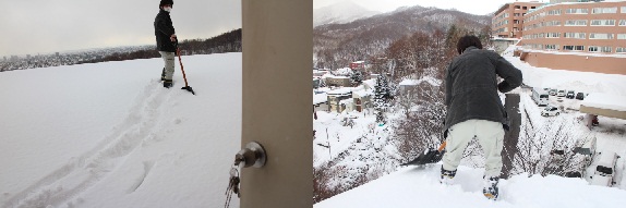 さて、次はいよいよ屋上です。ドアをあけると・・・膝まで埋まるほどの積雪です。雪をかきわけながら、建物の端はどこかな、と探りながらすすみます!