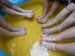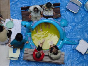 バスに乗って外食やホームの中庭で足湯など!(温泉のお湯を購入して行いました!)