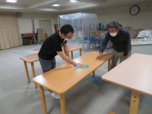 皆様こんにちは。新型コロナウイルスに加えて、これからはインフルエンザ、ノロウイルス等様々な感染症が流行してくる時期となります。敬樹園内での感染症対策の一つとして、ご利用者が毎日使用されている食卓テーブルの抗菌加工を実施いたしました。今回は(株)メーコー北海道様の協力をいただき無光触媒を施工しましたので、その時の様子をご紹介いたします。