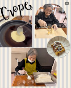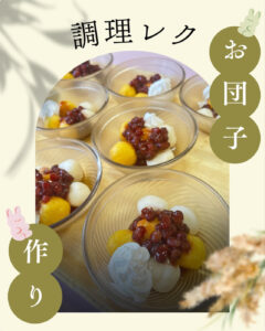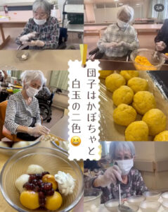 『調理レク~月見団子・クレープ編~』 2025.10.14 新着情報 特養 先日の記事でもお伝えしましたが、10月6日は「中秋の名月」ということで、10月2日の調理レクでは『月見団子』を作りました🌙今回は白玉とかぼちゃが入った黄色のお団子の2種類をご用意。お団子は豆腐が入って食べやすくなっており、「綺麗な色だね~」と見た目も喜んでいただけたようでした♫また、別の日には『クレープ作り』も行いました。調理レクの様子をご紹介していますので、ぜひインスタグラムからもご覧ください!!