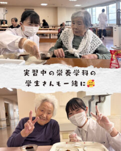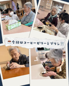 『おやつレク』 2025.11.27 新着情報 特養 先日、実習中の栄養学科の学生さんにも参加いただき、『おやつレク』を行いました!今回は、コーヒーゼリーとプリンを提供しましたが、ご利用者の皆さんにも喜んでいただけたようです♪レクの様子をご紹介していますので、是非インスタグラムからもご覧ください!!