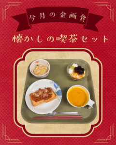 『栄養士企画食~9・10・11月分のご紹介~』 2026.01.09 新着情報 特養 ご提供から日にちが経過してしまいましたが・・・今回は、9月・10月・11月の3ヶ月分の『栄養士企画食』のご紹介をいたします!各月分をインスタグラムからもご紹介していますので、是非あわせてご覧ください!! ≪9月 懐かしの喫茶セット≫ ≪10月 秋野菜の天丼≫ ≪11月 きのこ入り塩あんかけ焼きそば≫