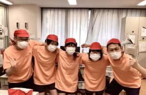 職員は赤白に分かれ二人羽織、ジェスチャーゲーム、障害物競争で競いました。