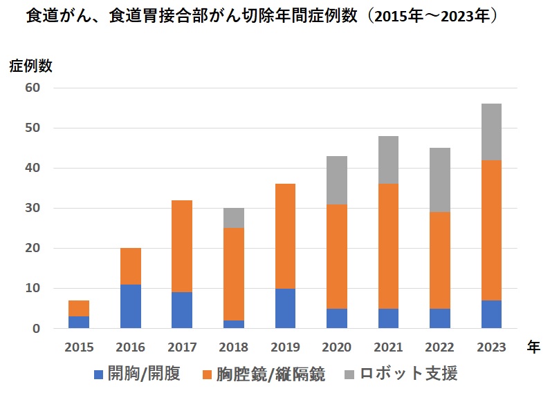 食道癌が最も多く、約90%を占めます。食道癌は胃癌や大腸癌と比較してリンパの流れに乗って転移しやすく予後が悪いと言われています。治療方法も多岐にわたり手術、化学療法、放射線療法を色々組み合わせて行う集学的治療が必要です。食道癌診療ガイドラインを遵守しながら患者さんに最適な治療法を提案いたします。手術は負担の少ない胸腔鏡、腹腔鏡補助で行います。さらにご高齢、並存病変をお持ちの患者さんに対してより負担の少ない縦隔鏡を利用した手術を行う事ができます。近年食道胃接合部癌が増加してきています。標準的な治療法として確立されておらず、学会でも注目されている領域です。食道胃接合部癌の手術法は、癌の組織型、病気の大きさ、位置によって異なります。患者さんに負担の少ない手術を提供いたします。